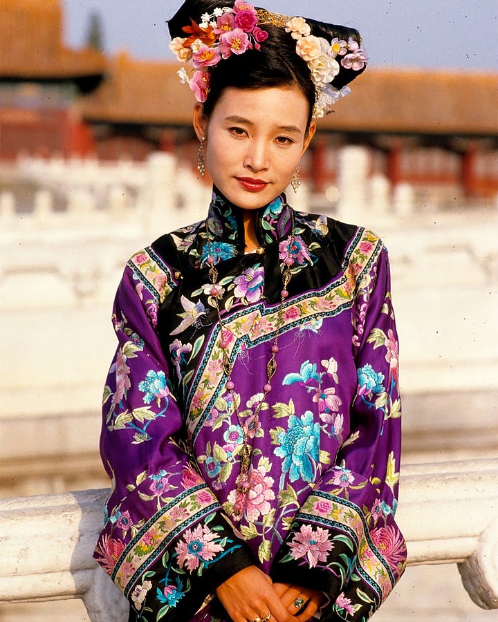 This sanding down happens most tragically to Empress Wanrong, who in the cultural imagination is probably closest cognate to the Habsburg archduchess who had her head chopped off. Wanrong was born into a powerful Manchu family under the Plain White Banner, which routinely married its scions into the royal family (both Wanrong and her younger brother Runqi married Aisin Gioro). She was well-educated, lively, and modern, but she also had a famously difficult marriage with her husband, for whom she was chosen not out of any desire of his own but because the adults around him (he was 16) felt her (then 17) to be the most suitable match. She had a thorny relationship with Wenxiu, was frivolous, had a temper, possibly suffered from mental illness and, despite her modern manners and sensibilities and the misery of her marriage, was attached to being empress and the status that came with it. She was said to have been kind and at times donated to charity, but was not an entirely benevolent figure.
