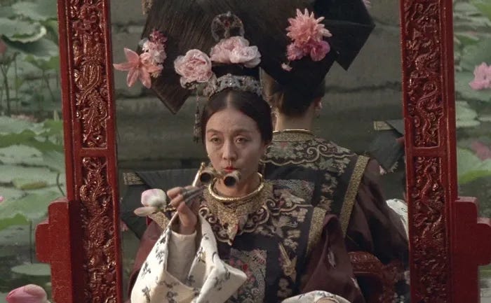 And while I certainly would not expect a biopic about Puyi to dive with any particular depth into his relative, Yoshiko Kawashima (Aisin Gioro Xianyu / Jin Bihui), her depiction as a depraved hypersexual bisexual temptress who flatly “hates China” is just not as interesting or as tense as the real person whose royalist, restoration-minded father gave her up for adoption at an extremely vulnerable age to her eventual rapist, the man who also groomed her into a Japanese asset. She was most likely genderqueer3, definitely queer in her sexuality, and I’m sure had a complicated relationship to a land that the family she was born into saw themselves as the rightful rulers of, to the new government that took it all away, and to the tradition that both gave her that power and, by dint of the gender she was given at birth and the status of the mother to whom she was born, confined her.